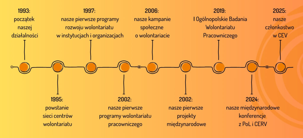 W 1993 roku zaczęliśmy naszą działalność. W kolejnym roku otworzyliśmy pierwsze w Polsce biuro pośrednictwa wolontariatu. Stało się ono skrzynką kontaktową łączącą wolontariuszy i wolontariuszki z organizacjami zainteresowanymi ich pomocą. Jednocześnie w ramach Akademii Wolontariatu rozpoczęliśmy prowadzenie szkoleń dla koordynatorów i koordynatorek, a także wolontariuszy i wolontariuszek oraz placówek korzystających z ich pomocy.